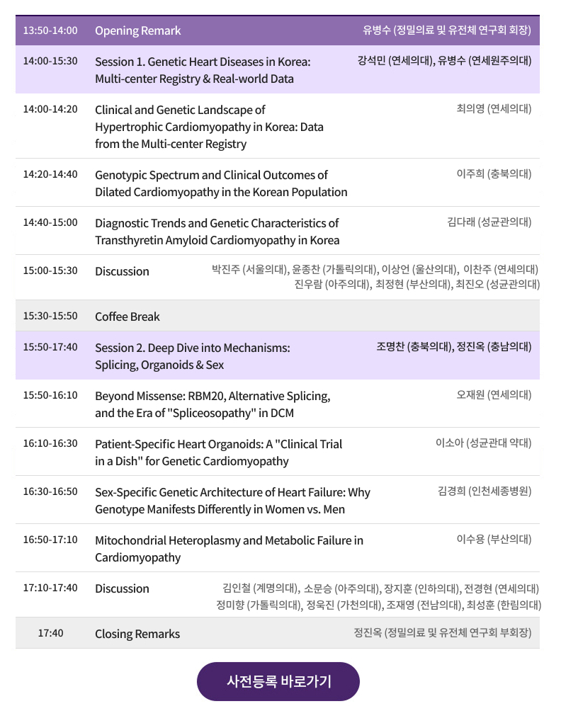 대한심부전학회 산하 정밀의료 및 유전체 연구회에서 오는 2026년 2월 6일(금) 동계 심포지엄을 개최하고자 합니다.